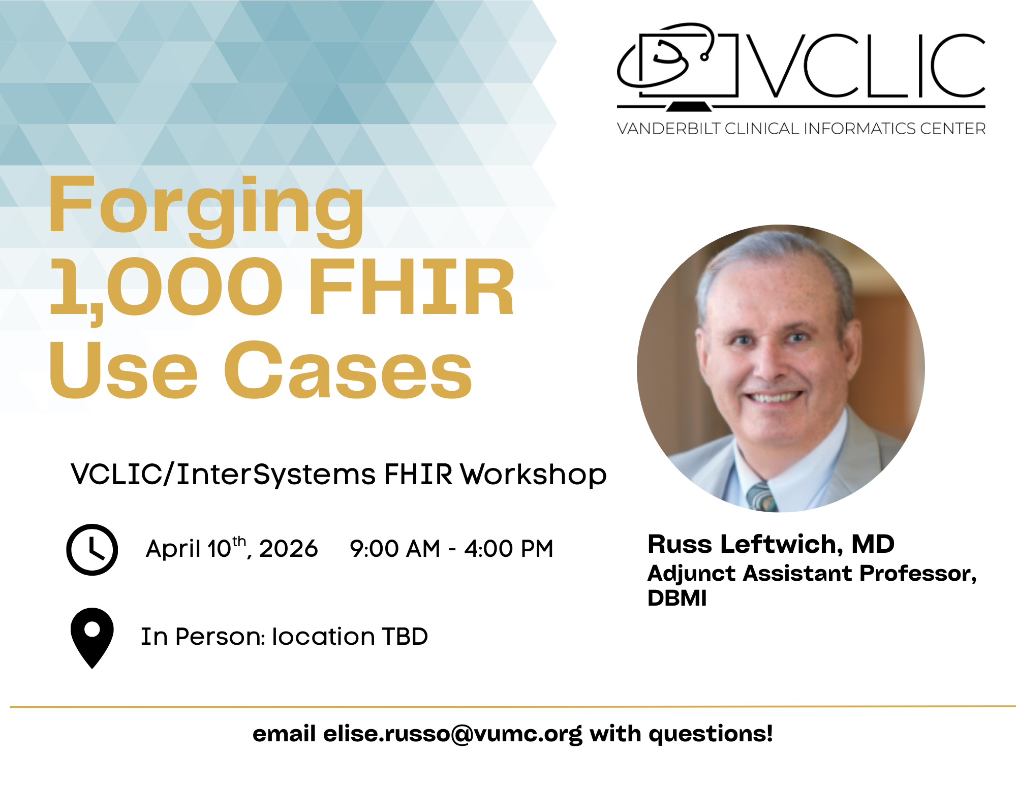 We are excited to team up with Russ Leftwich, MD, an adjunct VUMC DBMI Professor as well as Senior Clinical Advisor for Interoperability for InterSystems. He has traveled the world (and to other academic medical centers/universities) offering this workshop, and we are bringing him home to VUMC on Friday, April 10th for an all-day, in-person session. We have also added VUMC Professor Adam Wright, PhD, to the agenda. This event is open to VUMC and non-VUMC folks alike!